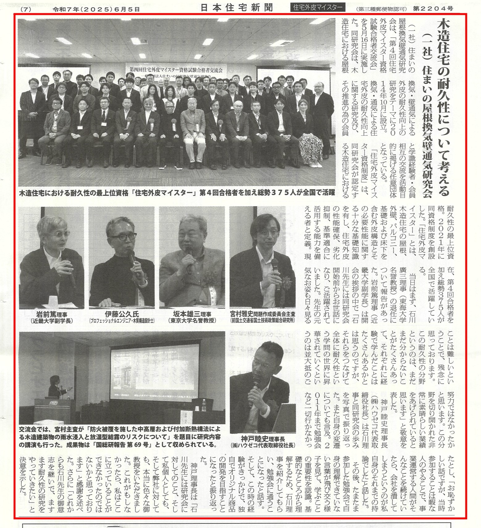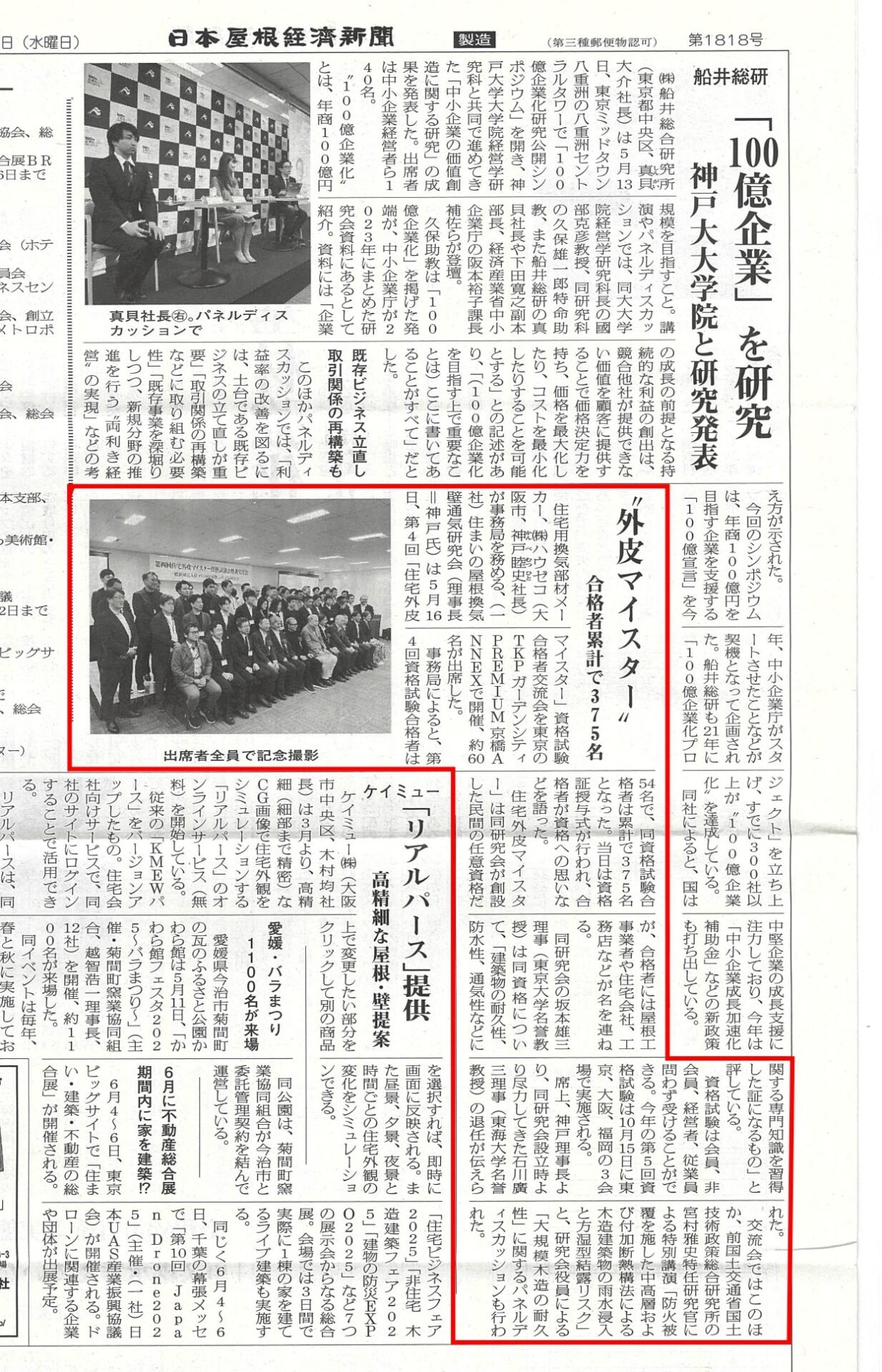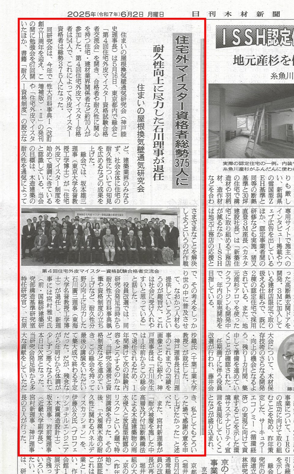 5月16日に開催致しました第四回住宅外皮マイスター資格試験合格者交流会が、日刊木材新聞、日本屋根経済新聞、日本住宅新聞、鉄鋼新聞に掲載されました。