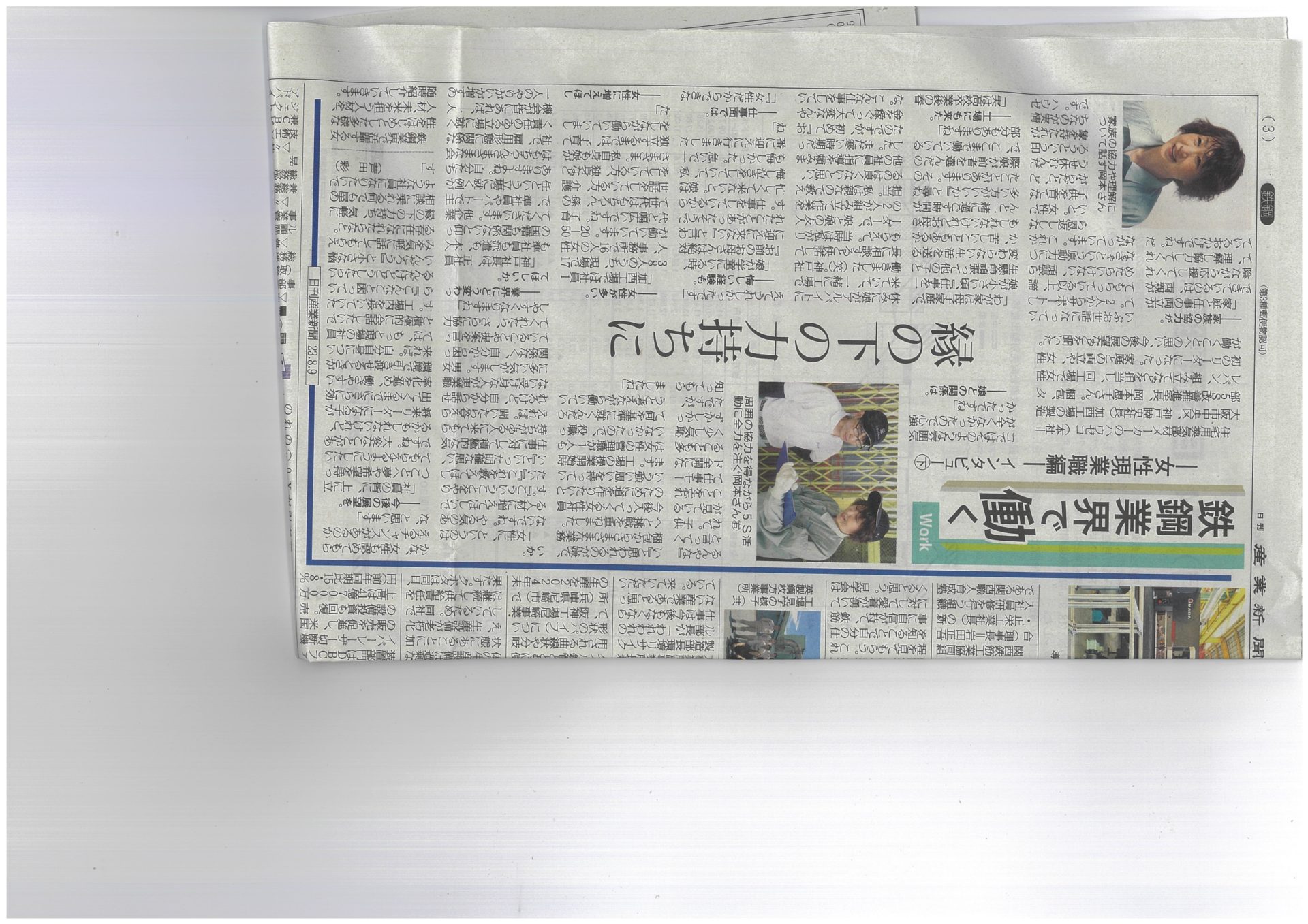 【メディア掲載】鉄鋼業界で働く女性インタビュー 記事掲載 2023.10.01 産業新聞に弊社(換気棟のメーカー株式会社ハウゼコ)社員の岡本恵子が、鉄鋼業界で働く女性現業職としてインタビューを受けた記事が掲載されました。 岡本は、加西工場操業開始から活躍する社員で、現在は製造部5S改善推進室の室長として責任者を務めています。 鉄鋼業界で働く女性社員として、製造の仕事の魅力やプライベートと仕事の両立について、責任者として働くことについて等、様々な観点から自身の考えを述べています。 内容盛りだくさんの興味深い記事となっています。