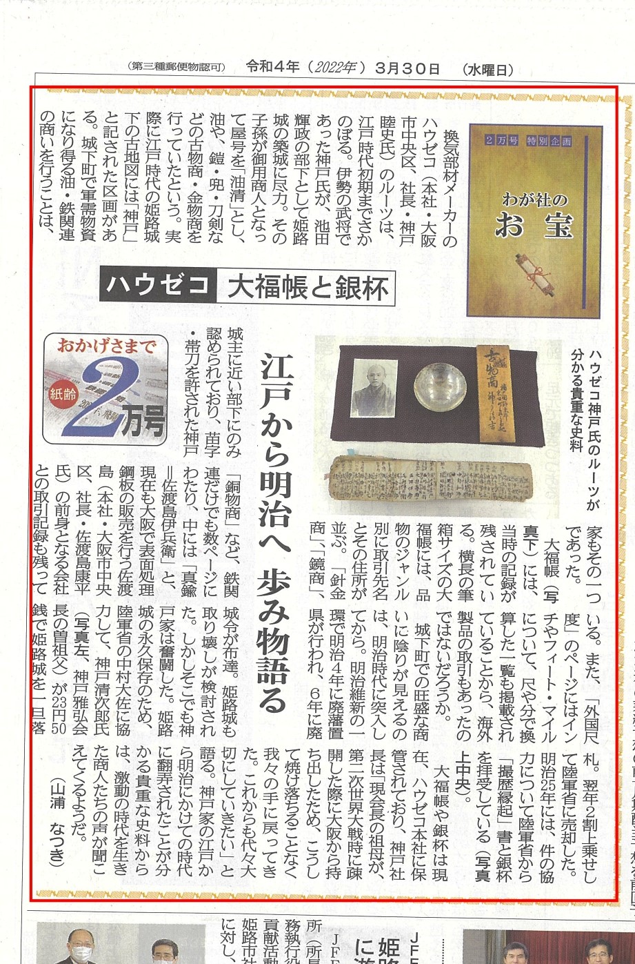 ハウゼコのルーツについて掲載されました。 記事掲載 2022.04.05 2022年3月30日発刊の鉄鋼新聞にハウゼコのルーツについて掲載されました。 ハウゼコのルーツは江戸時代までさかのぼり、油商、金物商、鎧、兜、刀剣などの古物商を行っていました。江戸時代の姫路城下の古地図には「神戸」と記された区画があります。 品物のジャンル別に取引先名とその住所が記された大福帳と、姫路城の永久保存のため協力し、陸軍省から拝受した銀杯は現在ハウゼコ本社に保管されています。