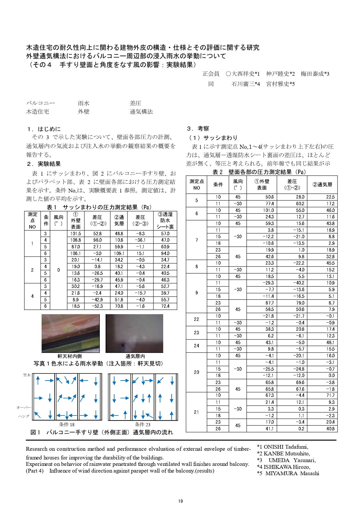 木造住宅の耐久性向上に関わる実験などを実施して発表⑩ 学会論文 2016.08.27 外壁通気構法におけるバルコニー周辺部の侵入雨水の挙動について その4 手すり壁面と角度をなす風の影響:実験結果 ハウゼコは、木造住宅の耐久性向上に関わる建物外皮の構造・仕様とその評価に関する研究をはじめとして、早くから多くの実験に積極的に取り組み、研究成果を建築学会で発表してきました。