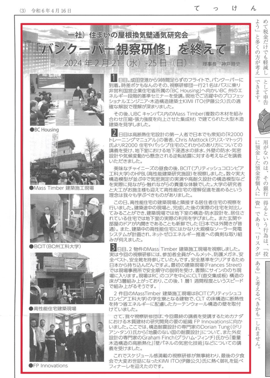 2024年2月21日~2月25日のカナダバンクーバーで行われた「Building Envelope(建物外皮)を学ぶ視察研修」が2024年4月16日発刊てっけんに掲載されました。