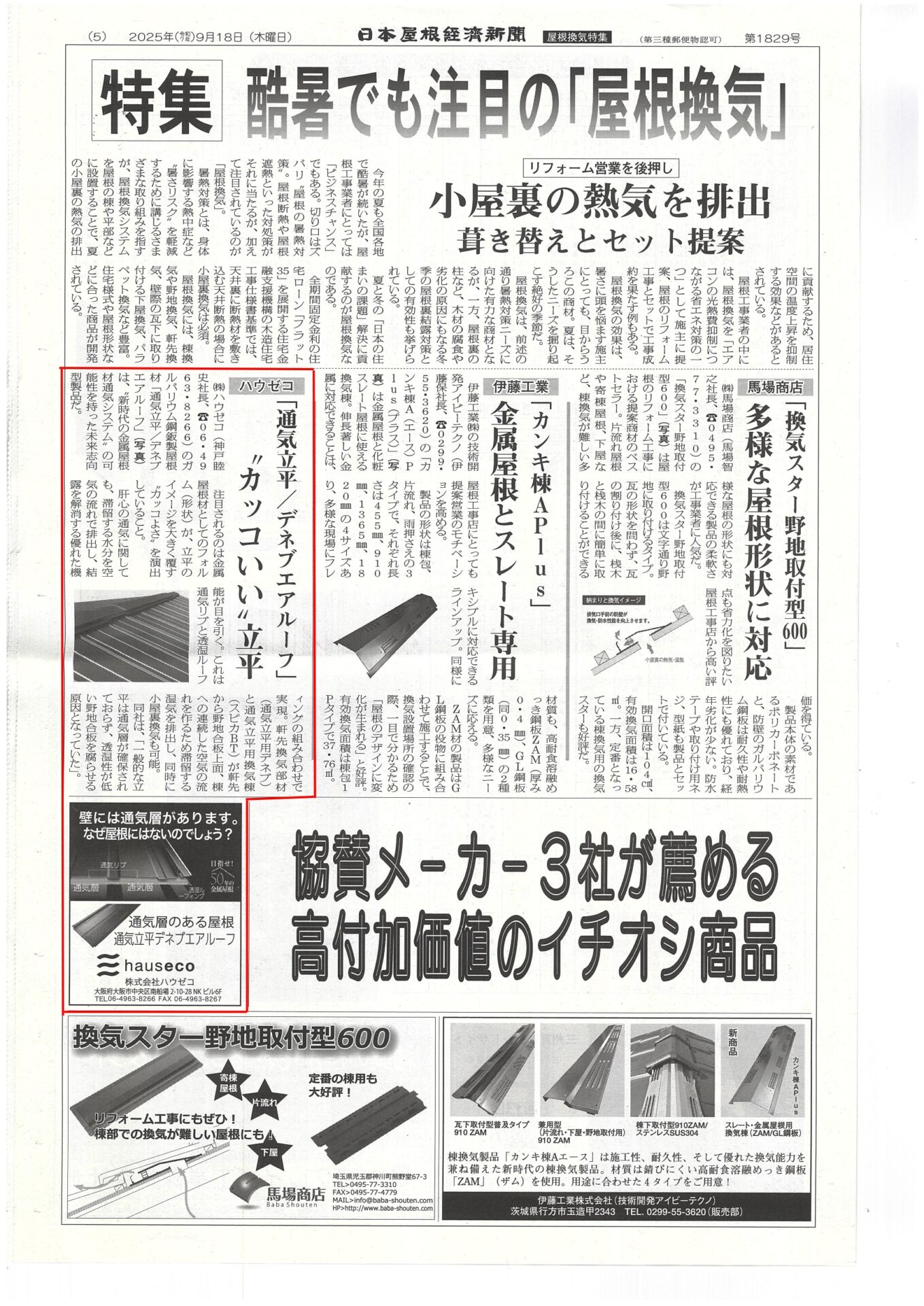 2025年9月18日発刊の日本屋根経済新聞に、住宅の長寿命化と省エネを実現する製品として、弊社製品「デネブエアルーフ」が掲載されました。
