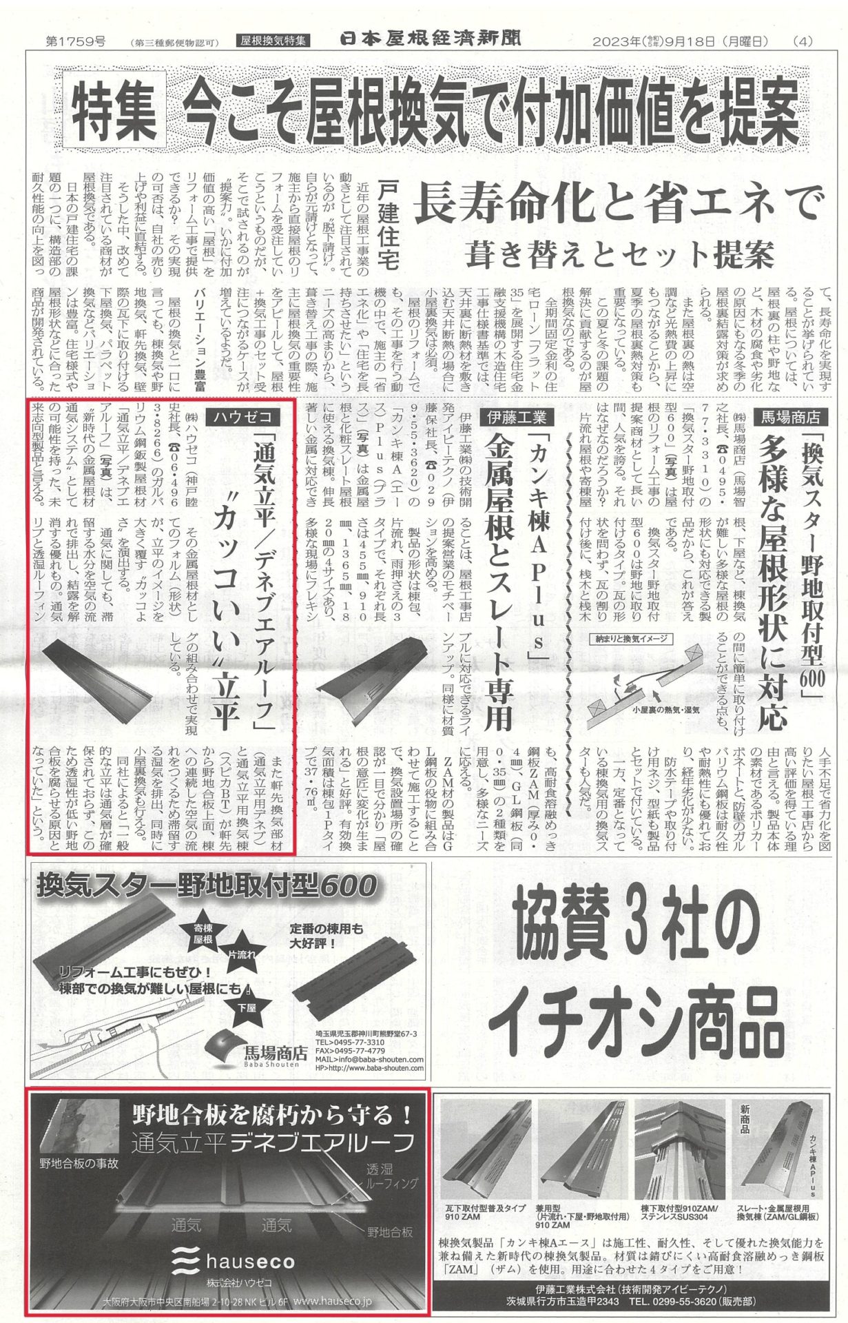 2023年9月18日発刊の日本屋根経済新聞に、住宅の長寿命化と省エネを実現する製品として、弊社製品「デネブエアルーフ」が掲載されました。
