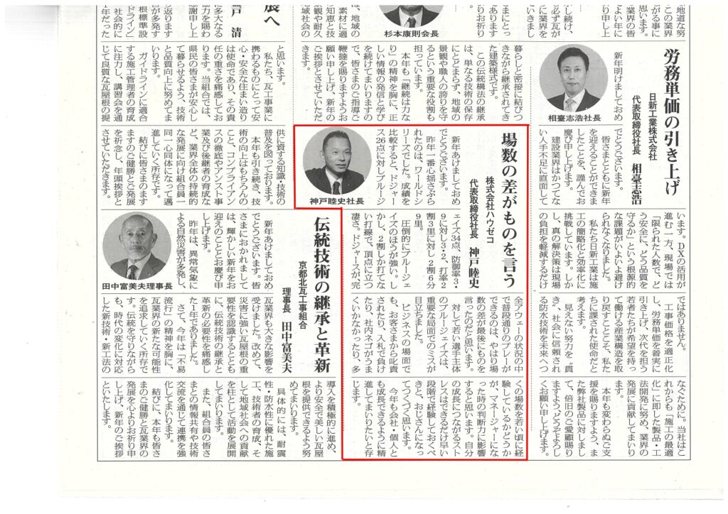 【メディア掲載】日本屋根経済新聞に社長の年頭所感掲載 記事掲載 2026.01.16 日本屋根経済新聞に換気棟のメーカーハウゼコの社長、神戸の年頭所感が掲載されました。 2025年、大きく盛り上がった「ワールドシリーズ」を振り返り、「ワールドシリーズ」から学べる成長のカギについてお話ししました。 本年も成長できるよう精進してまいります。