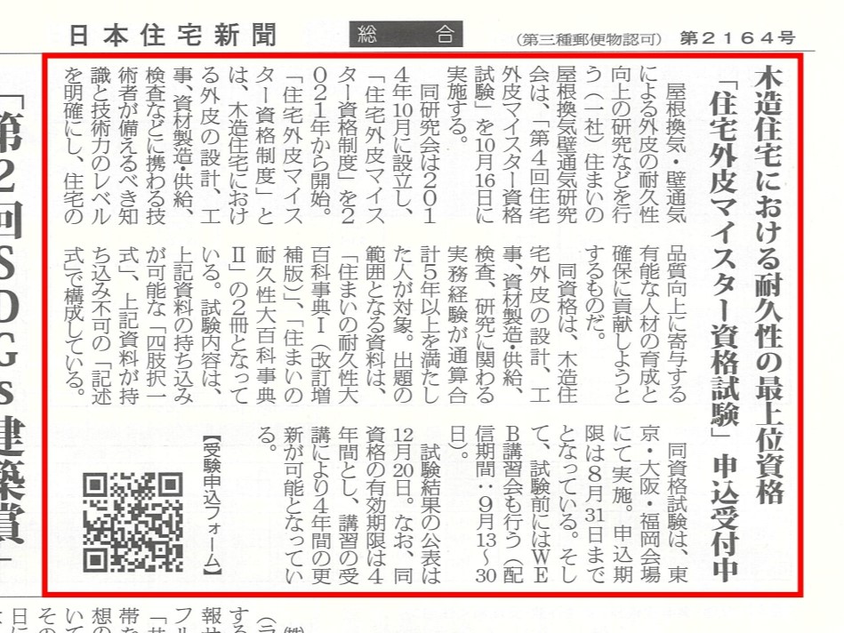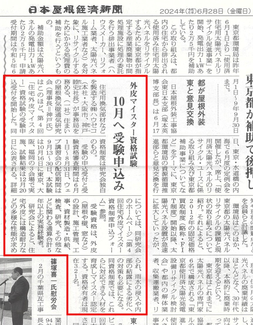 2024年10月16日に実施する「第4回住宅外皮マイスター資格試験」についての概要が日本住宅新聞・日本屋根経済新聞に記事掲載されました。