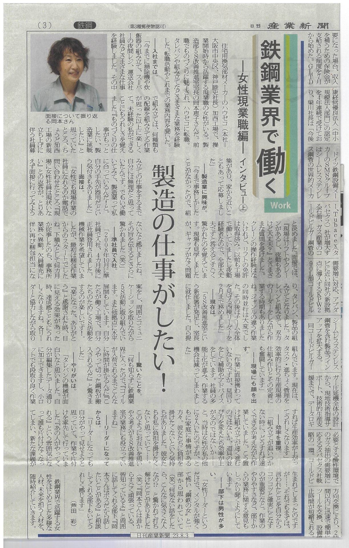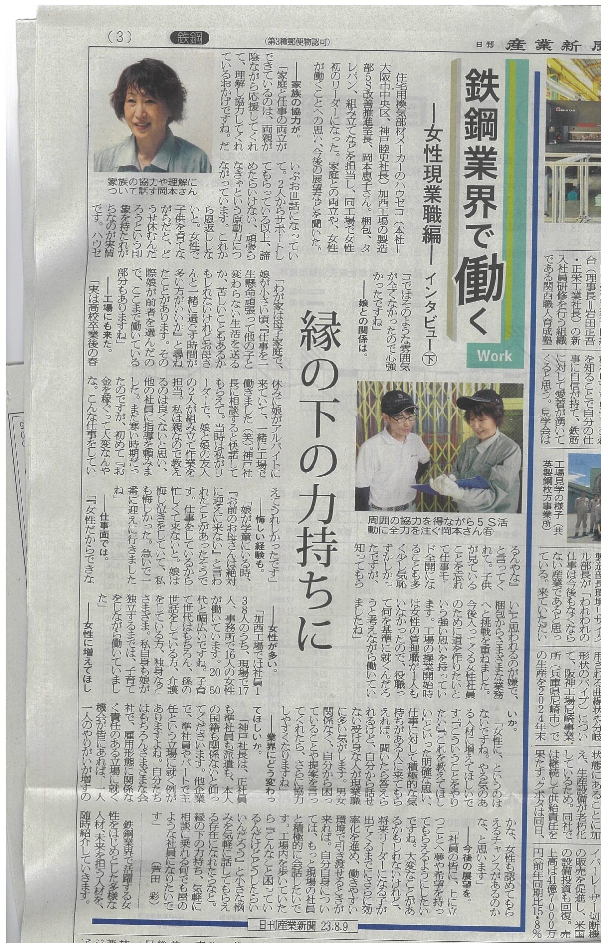 【メディア掲載】鉄鋼業界で働く女性インタビュー 記事掲載 2023.10.01 産業新聞に弊社(換気棟のメーカー株式会社ハウゼコ)社員の岡本恵子が、鉄鋼業界で働く女性現業職としてインタビューを受けた記事が掲載されました。 岡本は、加西工場操業開始から活躍する社員で、現在は製造部5S改善推進室の室長として責任者を務めています。 鉄鋼業界で働く女性社員として、製造の仕事の魅力やプライベートと仕事の両立について、責任者として働くことについて等、様々な観点から自身の考えを述べています。 内容盛りだくさんの興味深い記事となっています。