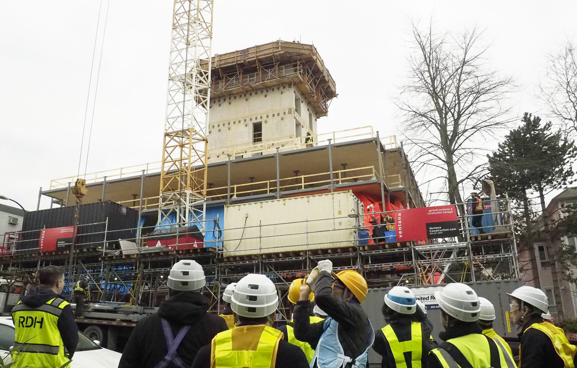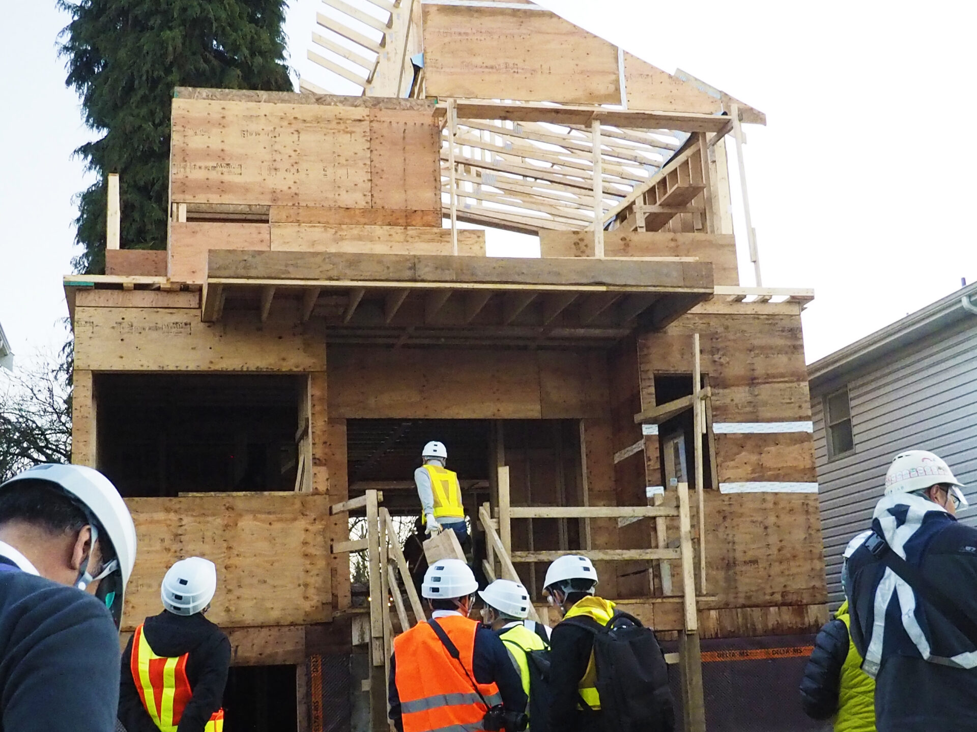 3日目は、2 物件のMass Timber 建築施工現場を視察。その後、構造耐震設計の専門家のDorian Tung(ドリアン・タン)氏から「地震のない国の耐震設計」について、また外皮設計の専門家のGraham Finch(グラハム・フィンチ)氏から「重量木造構造の高断熱化」「壁パネルの気密化技術」などについての講義を受けました。