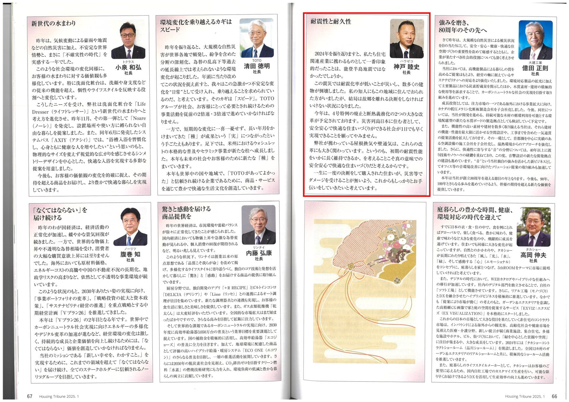 ハウジングトリビューンに社長の年頭所感掲載 記事掲載 2025.01.06 ハウジングトリビューンに換気棟のメーカーハウゼコの社長、神戸の年頭所感が掲載されました。 2024年に起こった「能登半島地震」を振り返り、一生に一度の決断をして購入された住まいが、災害等でダメージを受けることがないよう、これからもしっかりお手伝いをしていきたいとお話ししました。