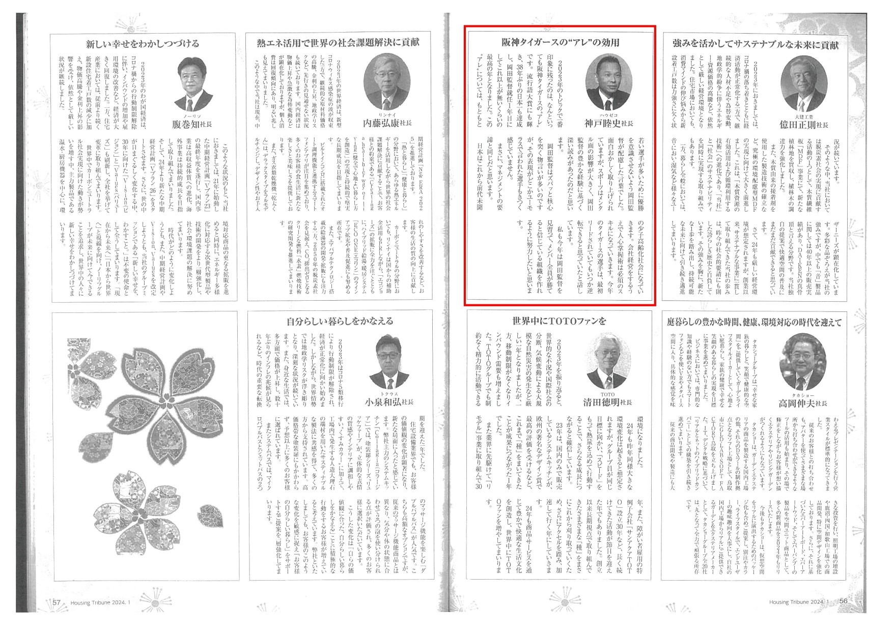 ハウジングトリビューンに社長の年頭所感掲載 記事掲載 2024.01.12 ハウジングトリビューンに換気棟のメーカーハウゼコの社長、神戸の年頭所感が掲載されました。 2023年の印象的なトピック「阪神タイガースの“アレ”」を振り返り、勝てる組織づくりへの意気込みについてお話しました。