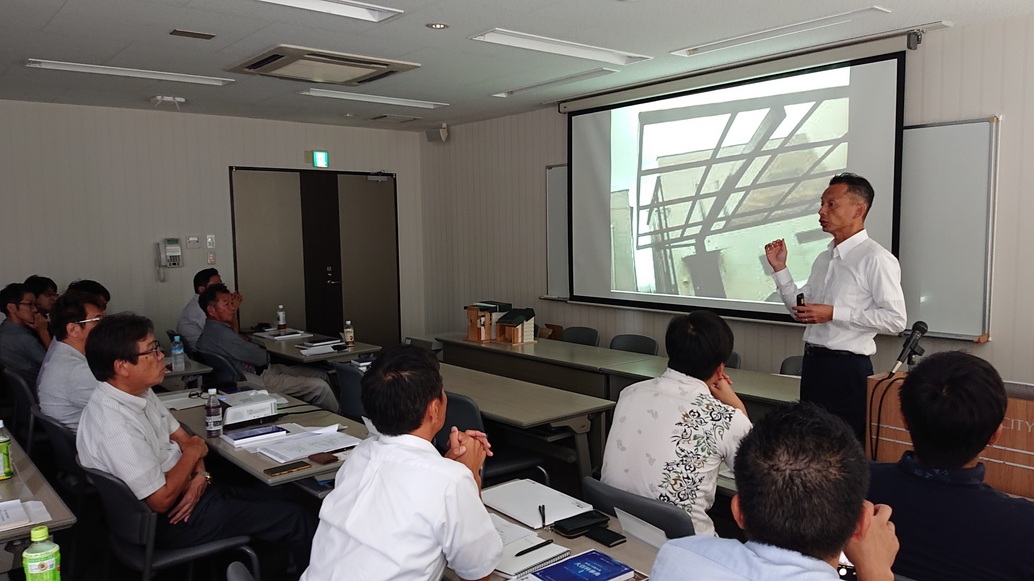 当日は全国から多数の会員様がお集まりになり、その中神戸睦史が講師を務め、昨夏近畿地方を直撃した台風23号の被害の様子や、キューブ型デザイン住宅に潜む問題点やその劣化事例、さらに防止方法に至るまで、結露しにくい木造住宅の造り方について講演。また、(一社)住まいの屋根換気壁通気研究会より出版した「住まいの耐久性大百科事典」より、世界の小屋裏換気の基準など紹介しました。ご参加の皆様におかれましては大変興味深 く耳を傾けて頂きました。