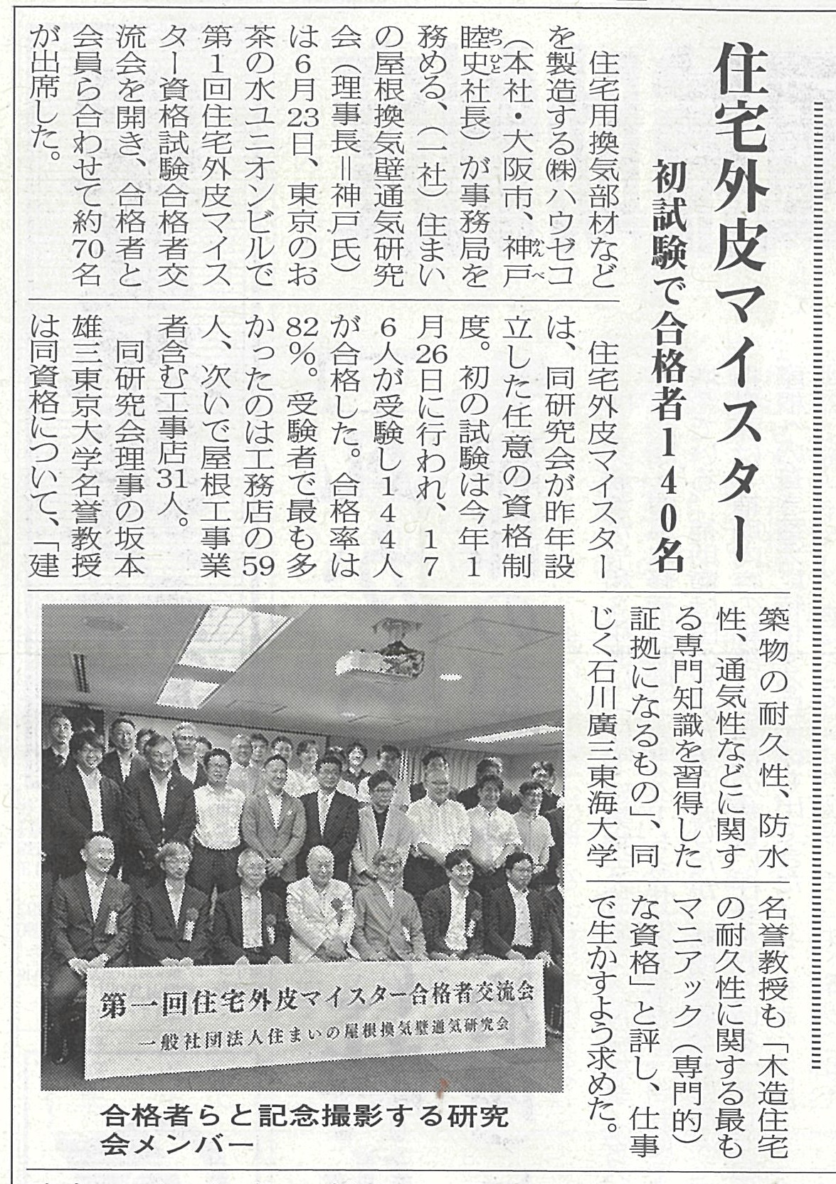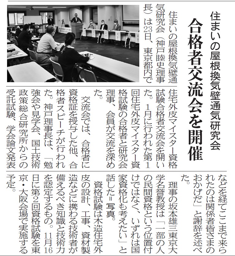 建通新聞・日本屋根新聞・ハウジングトリビューンに交流会掲載 記事掲載 2022.08.05 2022年6月23日に実施した第1回住宅外皮マイスター資格試験合格者交流会について、建通新聞、日本屋根経済新聞、ハウジングトリビューンに記事掲載されました。 6月23日に第一回住宅外皮マイスター資格試験合格者の交流会を開催しました。 合格者と研究会理事、研究会会員で交流を深め情報交換などを行いました。 第二回住宅外皮マイスター資格試験は2022年11月16日に東京・大阪の2会場で実施します。 申込期間は7月1日~9月30日です。