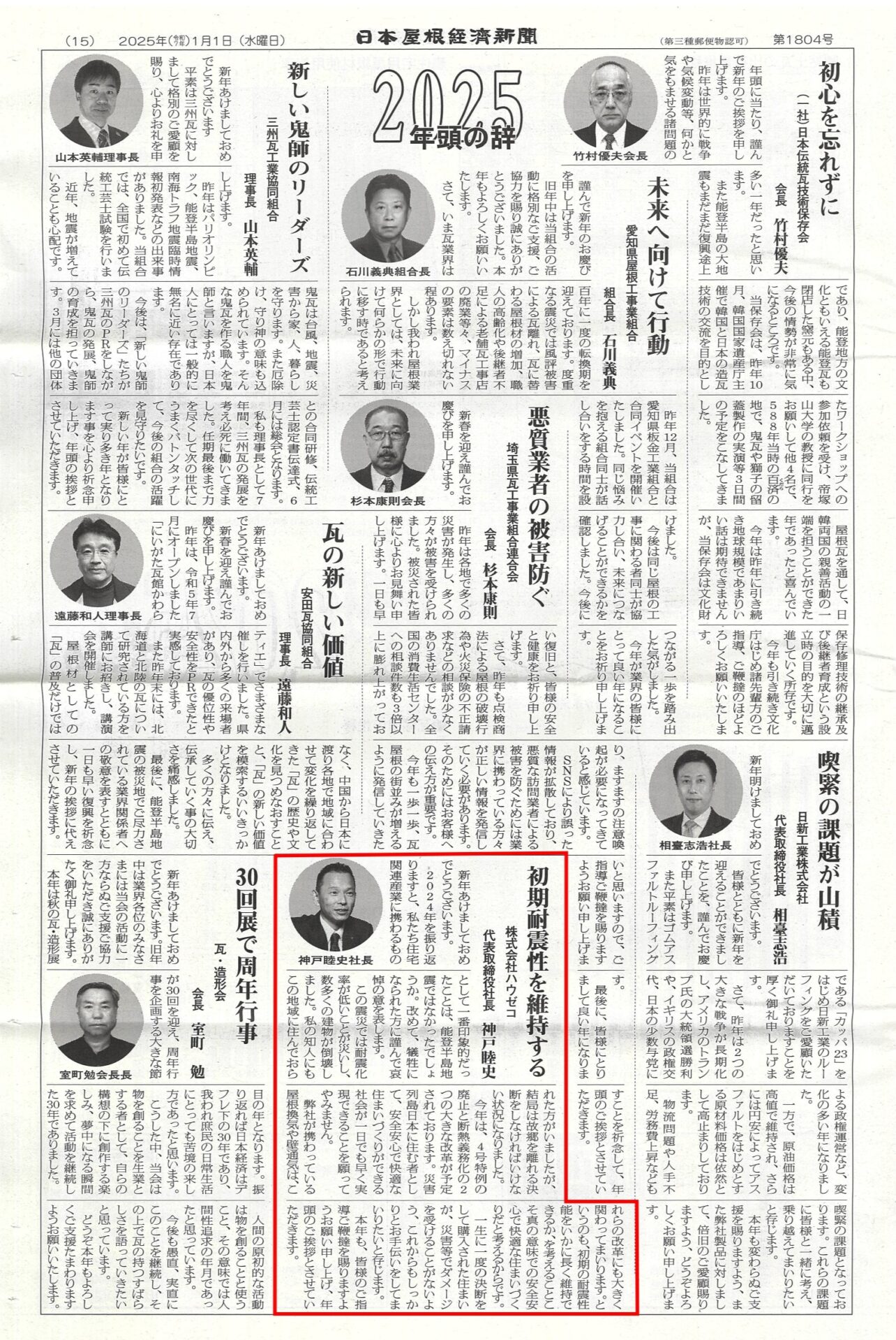 日本屋根経済新聞に社長の年頭所感掲載 記事掲載 2025.01.07 1月1日発刊の日本屋根経済新聞に換気棟のメーカーハウゼコの社長、神戸の年頭所感が掲載されました。 2024年に起こった「能登半島地震」を振り返り、一生に一度の決断をして購入された住まいが、災害等でダメージを受けることがないよう、これからもしっかりお手伝いをしていきたいとお話ししました。