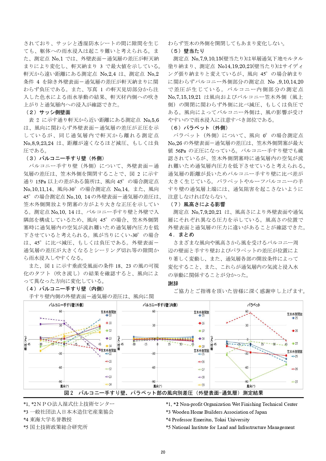 木造住宅の耐久性向上に関わる実験などを実施して発表⑩ 学会論文 2016.08.27 外壁通気構法におけるバルコニー周辺部の侵入雨水の挙動について その4 手すり壁面と角度をなす風の影響:実験結果 ハウゼコは、木造住宅の耐久性向上に関わる建物外皮の構造・仕様とその評価に関する研究をはじめとして、早くから多くの実験に積極的に取り組み、研究成果を建築学会で発表してきました。