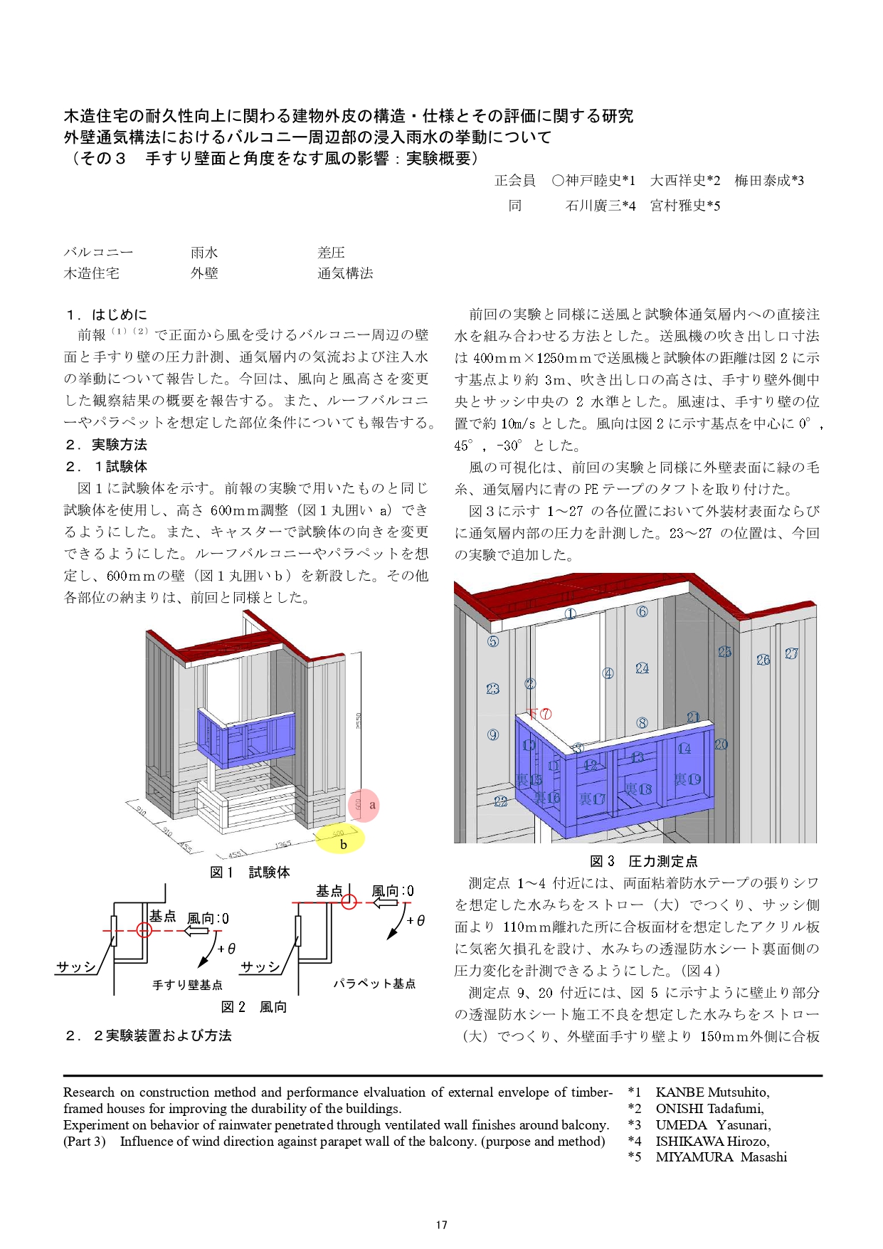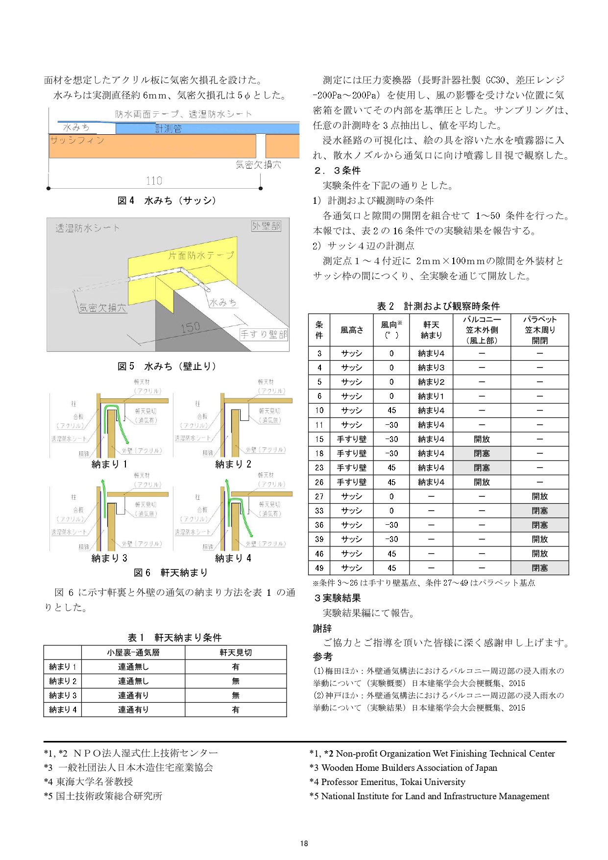 木造住宅の耐久性向上に関わる実験などを実施して発表⑨ 学会論文 2016.08.27 外壁通気構法におけるバルコニー周辺部の侵入雨水の挙動について その3 手すり壁面と角度をなす風の影響:実験概要 ハウゼコは、木造住宅の耐久性向上に関わる建物外皮の構造・仕様とその評価に関する研究をはじめとして、早くから多くの実験に積極的に取り組み、研究成果を建築学会で発表してきました。