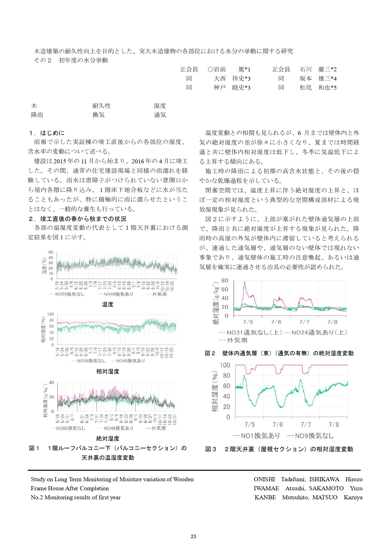 木造住宅の耐久性向上に関わる実験などを実施して発表⑫ 学会論文 2016.08.28 木造建築の耐久性向上を目的とした、実大木造建築物の各部位における水分の挙動に関する研究 その2 初年度の水分挙動 ハウゼコは、木造住宅の耐久性向上に関わる建物外皮の構造・仕様とその評価に関する研究をはじめとして、早くから多くの実験に積極的に取り組み、研究成果を建築学会で発表してきました。