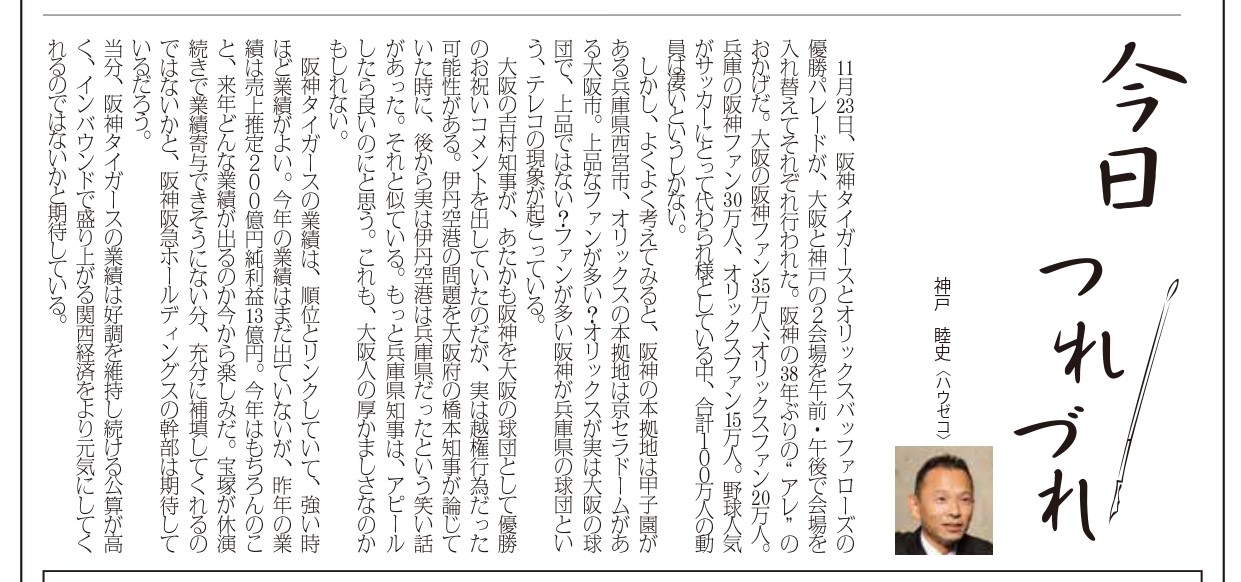 11月23日、阪神タイガースとオリックスバッファローズの優勝パレードが、大阪と神戸の2会場を午前・午後で会場を入れ替えてそれぞれ行われた。阪神の38年ぶりの“アレ”のおかげだ。大阪の阪神ファン35万人、 オリックスファン20万人。兵庫の阪神ファン30万人、オリックスファン15万人。野球人気がサッカーにとって代わられ様としている中、合計100万人の動員は凄いというしかない。