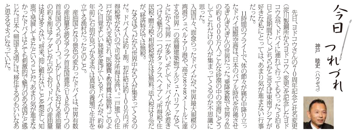先日、ヨドコウさんの70周年記念と社名変更(淀川製鋼所からヨドコウへ変更) を記念したヨドコウ会で、ドバイに連れて行ってもらった。5泊6日と長期間だし、どちらかと言えば東南アジアが好きな私にとっては、 あまり気が進まない行事だった。