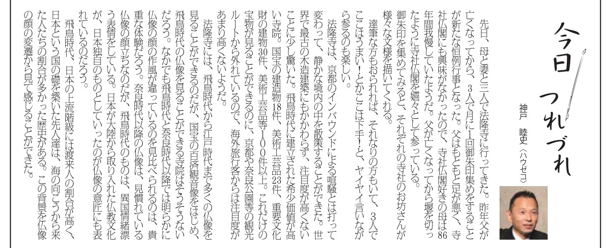 先日、母と妻と三人で法隆寺に行ってきた。昨年父が亡くなってから、3人で月に1回御朱印集めをすることが新たな恒例行事となった。父はもともと足が悪く、寺社仏閣にも興味がなかったので、寺社仏閣好きの母は86年間我慢していたようだ。父が亡くなってから堰を切ったように寺社仏閣を嬉々として参っている。御朱印を集めてみると、それぞれの寺社のお坊さんが様々な文様を描いてくれる。達筆な方もおられれば、それなりの方もいて、3人でここはうまい!とかここは下手!と、ヤイヤイ言いながら参るのも楽しい。