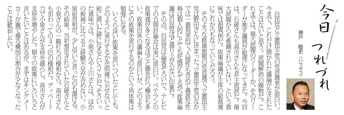 そのような群雄割拠の党首選で、 立憲民主党は野田さんに決まった。 立憲民主党のなかでは一番現実的で、 人間性も含めて愚直な性格は個人的にとても好感がもてるが、 政策論議は自民党ほど盛り上がらない印象だ。